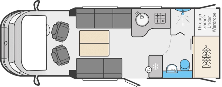 We had our own set of prerequisites. After visiting the motorhome show at the NEC we knew that we needed something bigger than a camper van but small enough to be manoeuvrable, we plan to tour Europe and some sites are not suitable for long motorhomes. It had to have a seperate shower and toilet, not a wet room with a wrap around curtain we also needed a good size comfortable bed. Finally, a decent size garage at the back so we could store bikes inboard and not rely on a rack on the back that extended the length further.